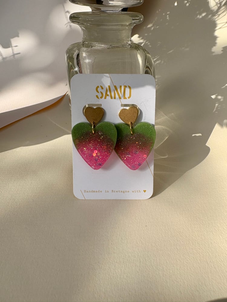 Paire de boucles d’oreilles réalisée en résine bio avec une attache cœur en acier chirurgical.