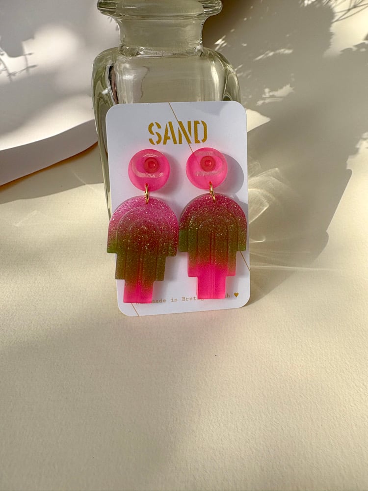 Paire de boucles d’oreilles réalisée en résine bio. Les attaches et tiges sont en acier chirurgical.